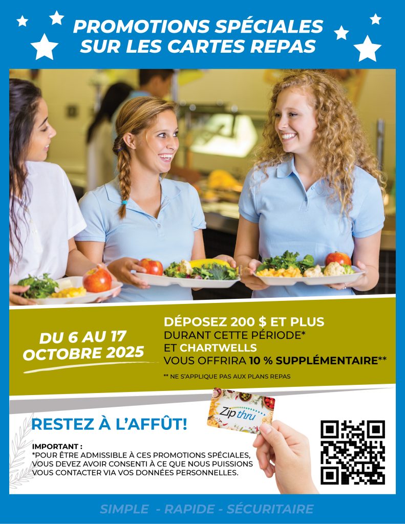La cafétéria ouvre tous les matins à 8 h 00, à l’édifice les Draveurs, et à 8 h 15, à l’édifice les Estacades pour ceux et celles qui n’auraient pas eu le temps de prendre leur petit déjeuner à la maison. Sinon, il est possible d’acheter une collation à la pause et le diner est servi à partir de 11 h 45.